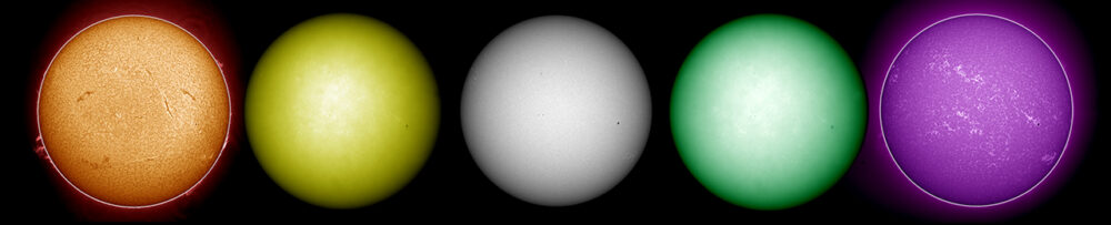 Neue Fleckenstrukturen zeigen sich auf den Übersichtsaufnahmen H-Alpha-Licht (656nm), im Natriumlicht (589nm), im Weißlicht (540nm), im Magnesium-Licht (517nm) und im Kalzium-Licht (393nm). Am Sonnenrand zeigen sich schöne Protuberanzen.