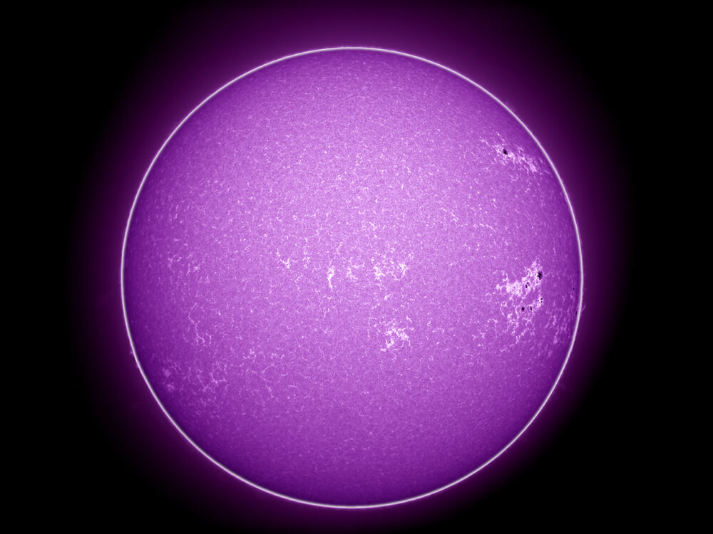 Sonnenscheibe im Kalzium-Licht (K-Linie); Lunt CaK-Modul (Bandbreite von 0,24 nm bei 393 nm) am Takahashi FC-76DS (Brennweite 570 mm, Öffnung: 76 mm); Kamera: PointGrey Grasshopper3-U3-28S5M; Bildverarbeitung: 500 von 2500 Picts in Avistack und Photoshop bearbeitet.