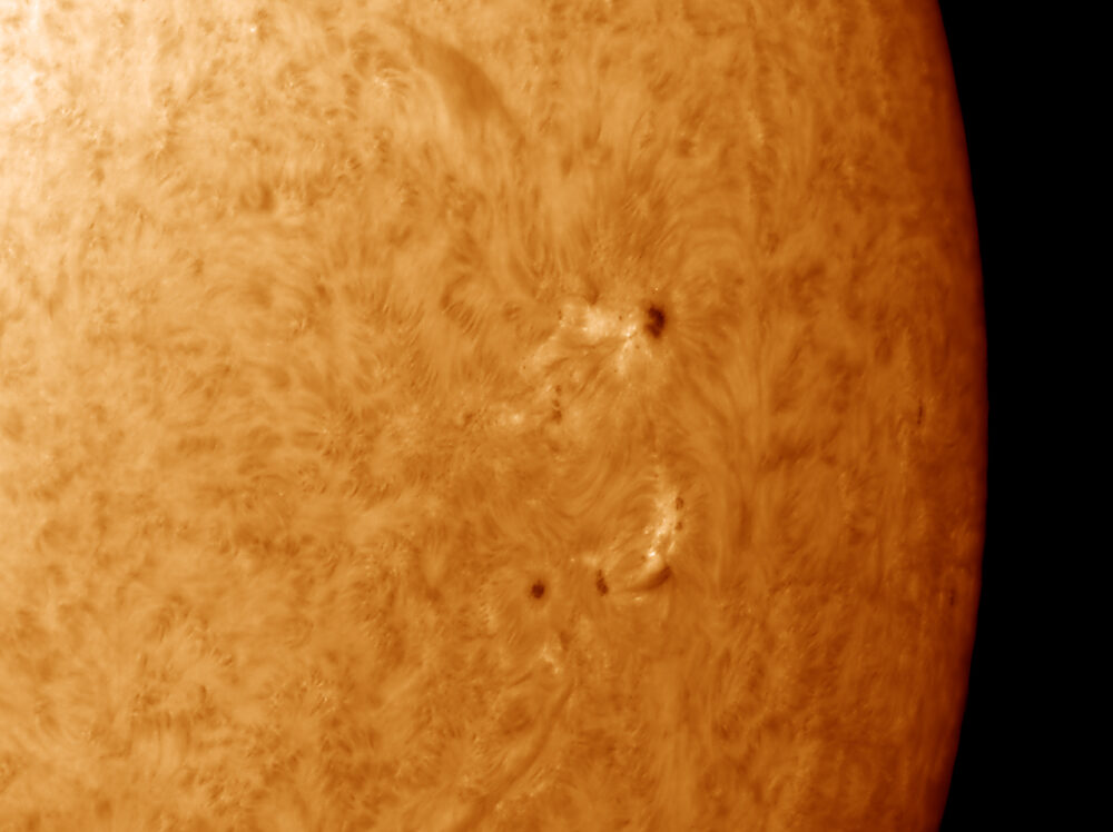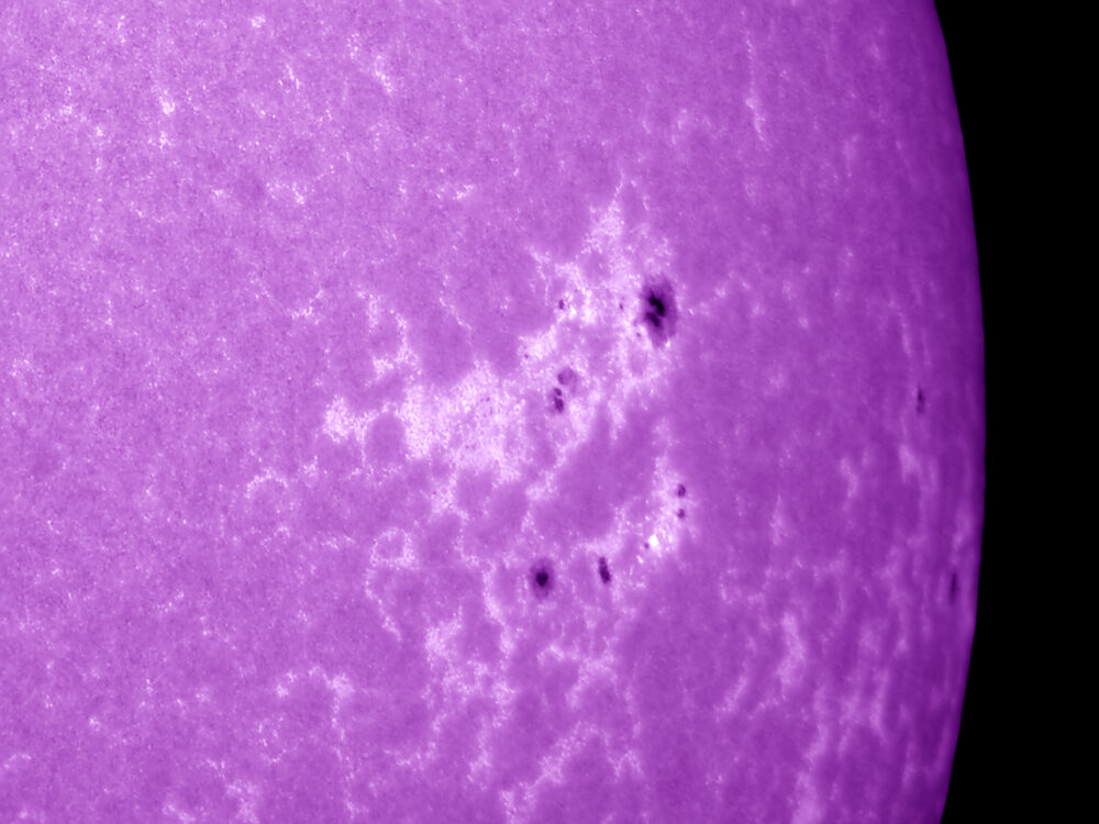 Sonnenflecken im Kalzium-Licht; Lunt CaK-Modul (B600) am Takahashi TOA-130 mit FFC (Brennweite 2250 mm, Öffnung: 130 mm, Bandbreite von 2,4 Angström bei 393 nm); Kamera: PointGrey Grasshopper3-U3-28S5M; Bildverarbeitung: 500 von 2500 Picts in Avistack und Photoshop bearbeitet.