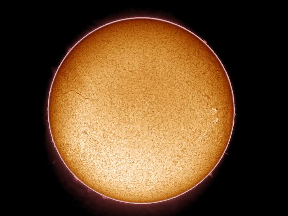 Sonnenscheibe im H-Alpha-Licht; Coronado Solarmax90 (Bandbreite 0,7nm bei 656 nm) am Takahashi FC-76DS (Brennweite 570 mm, Öffnung: 76 mm); Kamera: PointGrey Grasshopper3-U3-28S5M; Bildverarbeitung: 500 von 2500 Picts in Avistack und Photoshop bearbeitet.