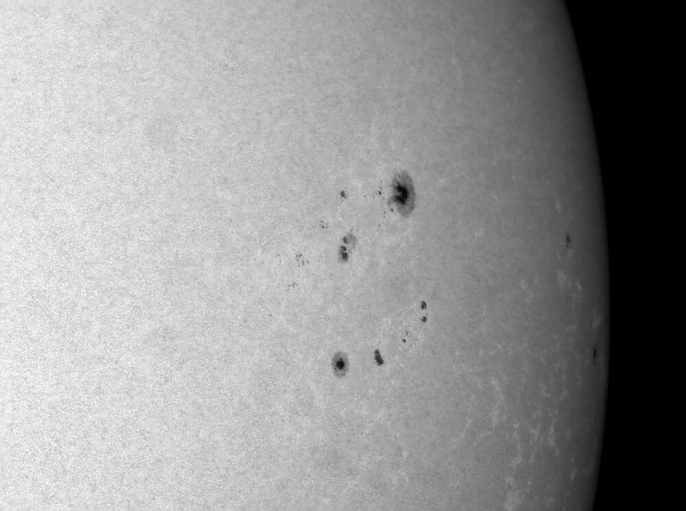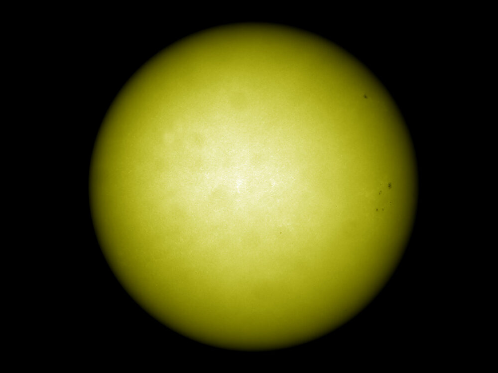 Sonnenflecken in Natrium-Licht (D-Linie); Daystar Quark Natrum-Filter (Bandbreite 0,5nm bei 589nm) an einem Canon-Objektiv (Brennweite 135 mm, Öffnung: 67 mm); Kamera: PointGrey Grasshopper3-U3-28S5M; Bildverarbeitung: 500 von 2500 Picts in Avistack und Photoshop bearbeitet.