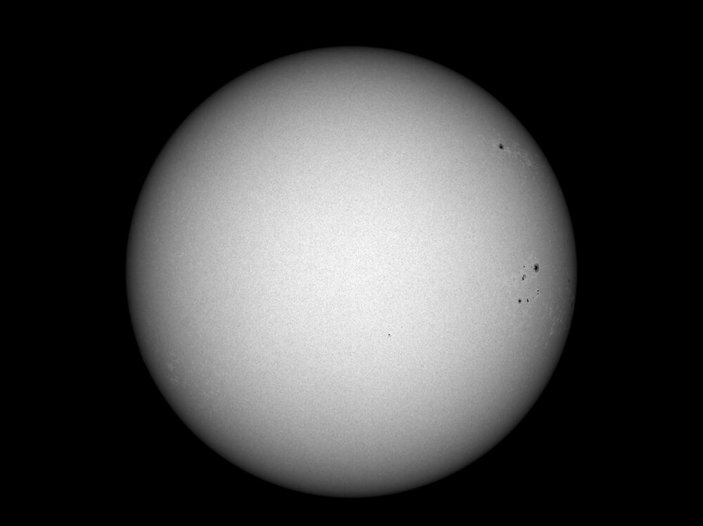 Sonnenscheibe im Weißlicht; Astro Solar Safety Film Photo (OD=3,8) mit Baader Solar Continuum Filter (mit der Bandbreite von 10 Angström um 540nm) am Takahashi FC-76DS (Brennweite 570 mm, Öffnung: 76 mm); Kamera: PointGrey Grasshopper3-U3-28S5M; Bildverarbeitung: 500 von 2500 Picts in Avistack und Photoshop bearbeitet.