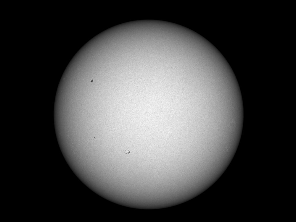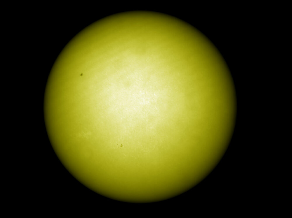 Sonnenflecken in Natrium-Licht (D-Linie); Daystar Quark Natrum-Filter (Bandbreite 0,5nm bei 589nm) an einem Canon-Objektiv (Brennweite 135 mm, Öffnung: 67 mm); Kamera: PointGrey Grasshopper3-U3-28S5M; Bildverarbeitung: 500 von 2500 Picts in Avistack und Photoshop bearbeitet.