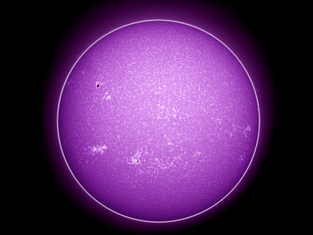 Sonnenscheibe im Kalzium-Licht (K-Linie); Lunt CaK-Modul (Bandbreite von 0,24 nm bei 393 nm) am Takahashi FC-76DS (Brennweite 570 mm, Öffnung: 76 mm); Kamera: PointGrey Grasshopper3-U3-28S5M; Bildverarbeitung: 500 von 2500 Picts in Avistack und Photoshop bearbeitet.