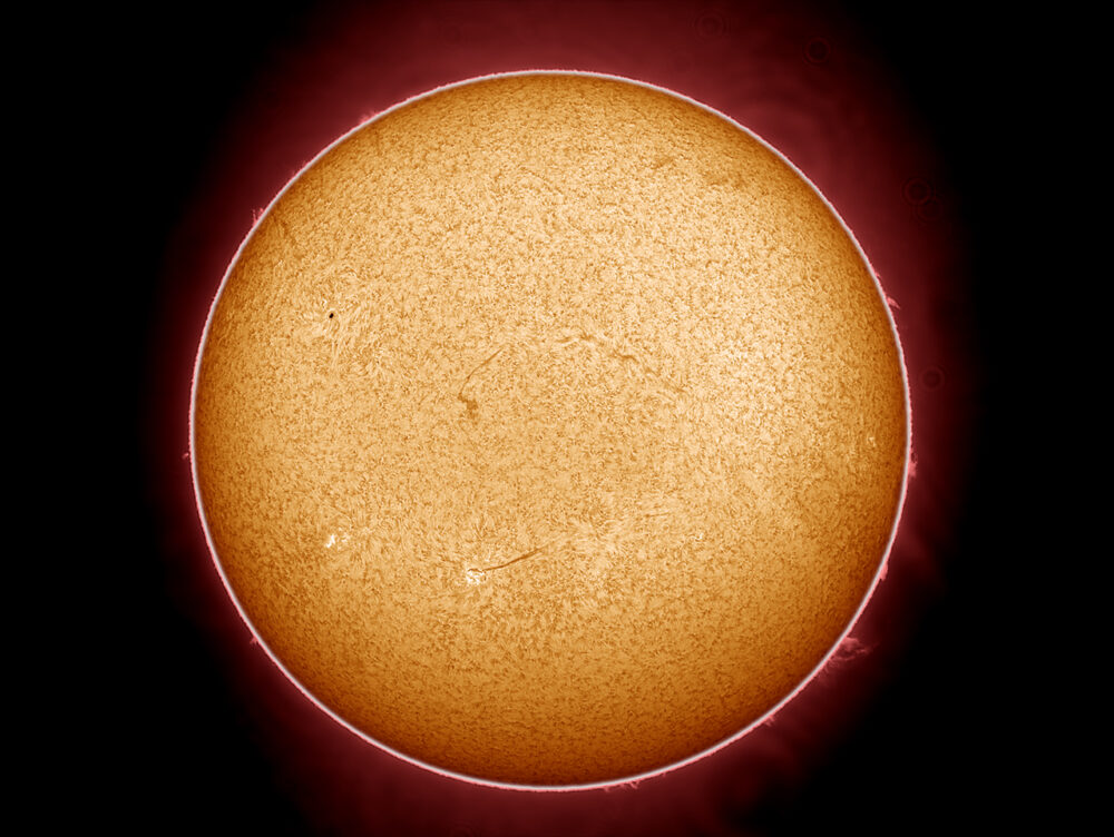 Sonnenscheibe im H-Alpha-Licht; Coronado Solarmax90 (Bandbreite 0,7nm bei 656 nm) am Takahashi FC-76DS (Brennweite 570 mm, Öffnung: 76 mm); Kamera: PointGrey Grasshopper3-U3-28S5M; Bildverarbeitung: 500 von 2500 Picts in Avistack und Photoshop bearbeitet.