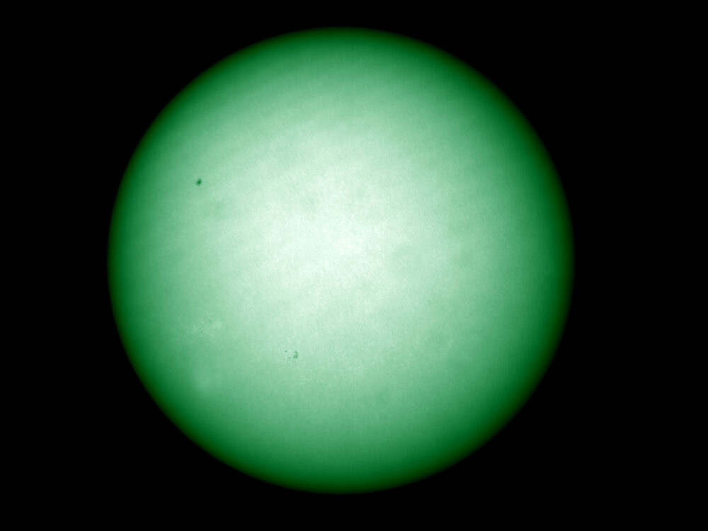 Sonnenscheibe im Magnesium-Licht (B2-Linie); Daystar Quark Magnesium-Filter (mit der Bandbreite von 10 Angström um 517nm) am Canon-Objektiv (Brennweite 135 mm, Öffnung: 67 mm); Kamera: PointGrey Grasshopper3-U3-28S5M; Bildverarbeitung: Einzelbild in Photoshop bearbeitet.