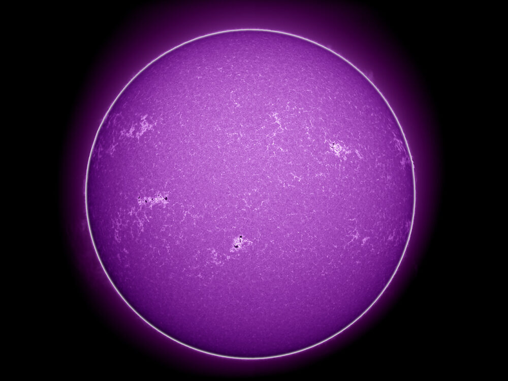 Sonnenscheibe im Kalzium-Licht (K-Linie); Lunt CaK-Modul (Bandbreite von 0,24 nm bei 393 nm) am Takahashi FC-76DS (Brennweite 570 mm, Öffnung: 76 mm); Kamera: PointGrey Grasshopper3-U3-28S5M; Bildverarbeitung: 500 von 2500 Picts in Avistack und Photoshop bearbeitet.