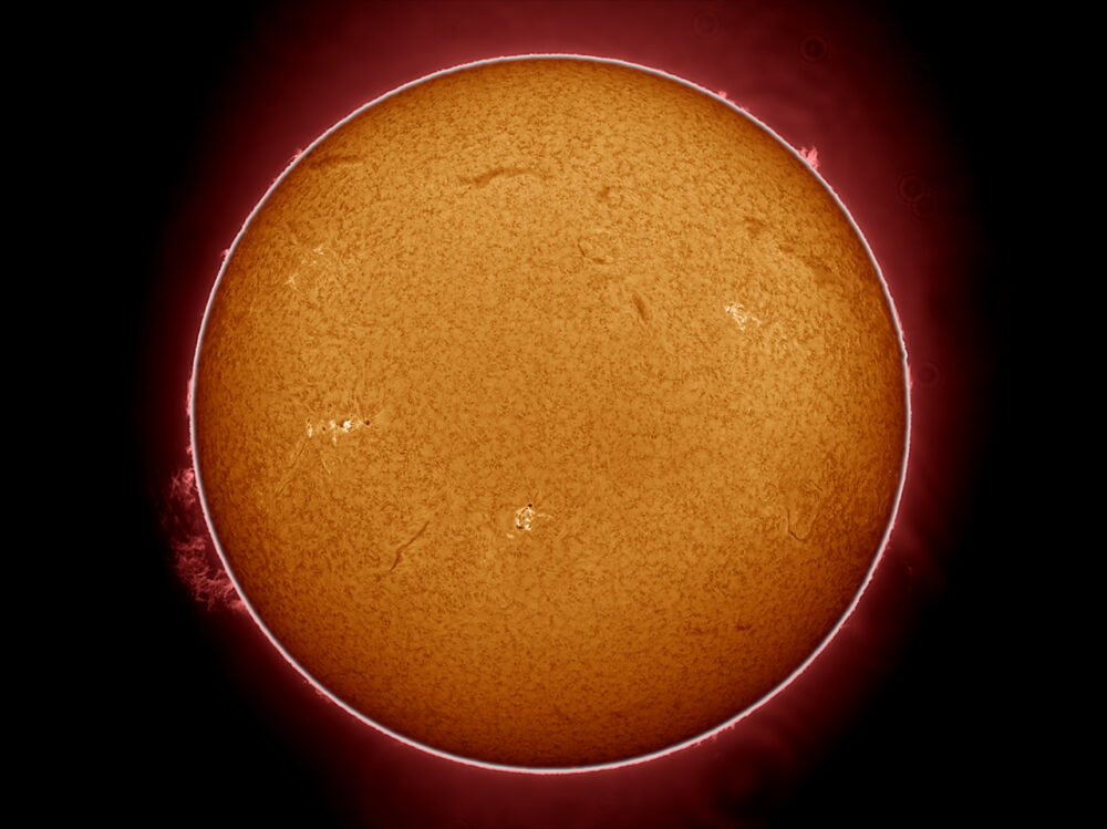 Nahezu fleckenlos zeigt sich die Sonne auf den Übersichtsaufnahmen H-Alpha-Licht (656nm), im Natriumlicht (589nm), im Weißlicht (540nm), im Magnesium-Licht (517nm) und im Kalzium-Licht (393nm). Am Sonnenrand zeigen sich schöne Protuberanzen.