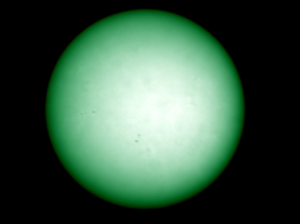 Sonnenscheibe im Magnesium-Licht (B2-Linie); Daystar Quark Magnesium-Filter (mit der Bandbreite von 10 Angström um 517nm) am Canon-Objektiv (Brennweite 135 mm, Öffnung: 67 mm); Kamera: PointGrey Grasshopper3-U3-28S5M; Bildverarbeitung: Einzelbild in Photoshop bearbeitet.