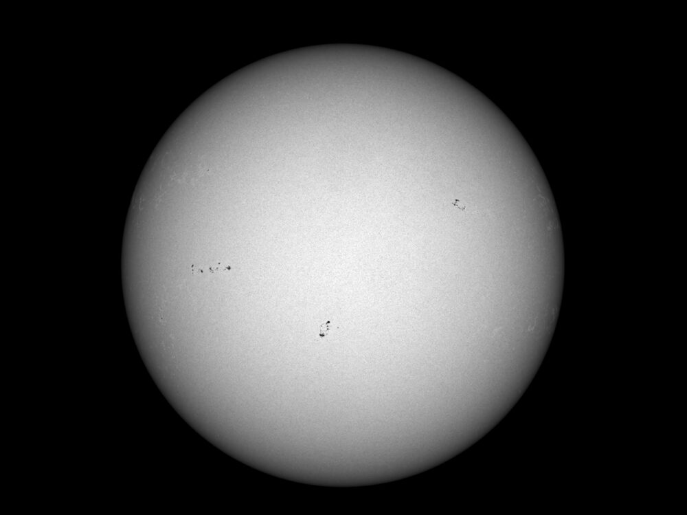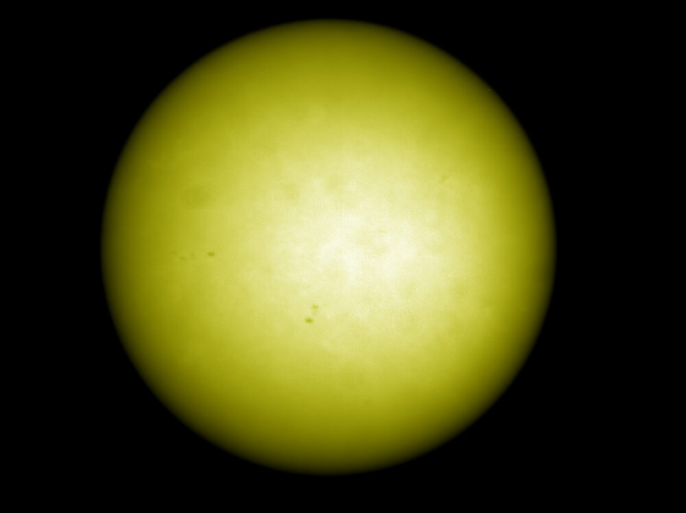 Sonnenflecken in Natrium-Licht (D-Linie); Daystar Quark Natrum-Filter (Bandbreite 0,5nm bei 589nm) an einem Canon-Objektiv (Brennweite 135 mm, Öffnung: 67 mm); Kamera: PointGrey Grasshopper3-U3-28S5M; Bildverarbeitung: 500 von 2500 Picts in Avistack und Photoshop bearbeitet.