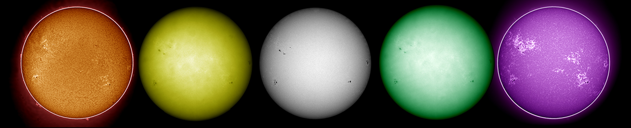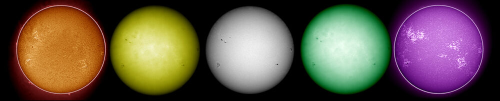 Komposit der Übersichtsaufnahmen der Sonne im H-Alpha-, Natrium-, Weiß-, Magnesium- und Kalzium-Licht: