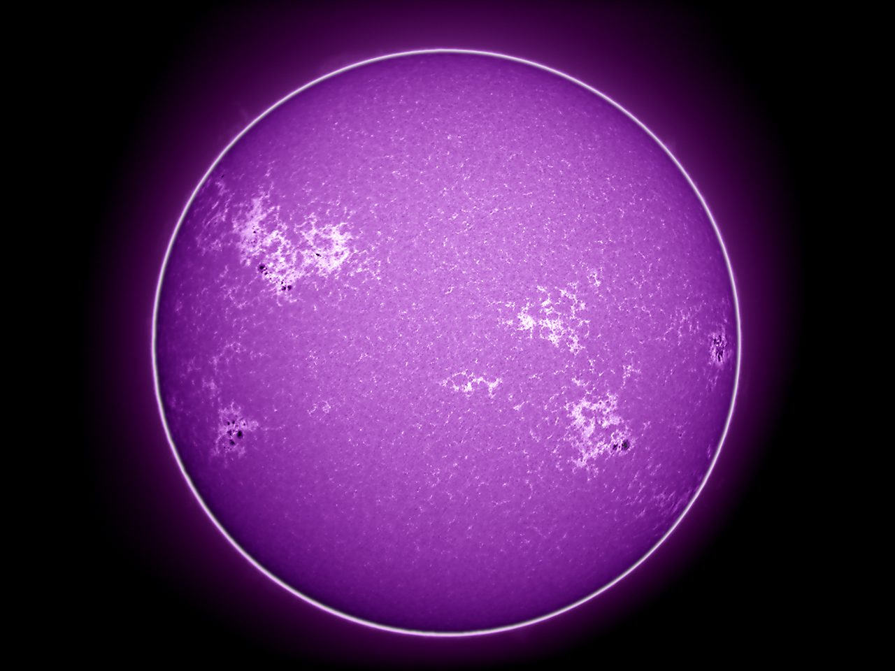 Sonnenscheibe im Kalzium-Licht (K-Linie); Lunt CaK-Modul (Bandbreite von 0,24 nm bei 393 nm) am Takahashi FC-76DS (Brennweite 570 mm, Öffnung: 76 mm); Kamera: PointGrey Grasshopper3-U3-28S5M; Bildverarbeitung: 500 von 2500 Picts in Avistack und Photoshop bearbeitet.
