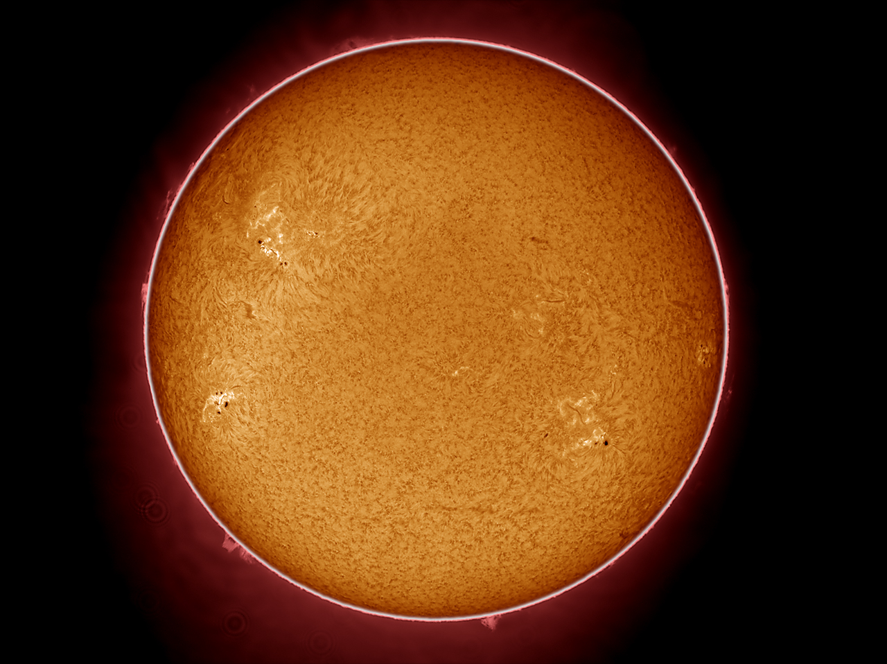 Sonnenscheibe im H-Alpha-Licht; Coronado Solarmax90 (Bandbreite 0,7nm bei 656 nm) am Takahashi FC-76DS (Brennweite 570 mm, Öffnung: 76 mm); Kamera: PointGrey Grasshopper3-U3-28S5M; Bildverarbeitung: 500 von 2500 Picts in Avistack und Photoshop bearbeitet.