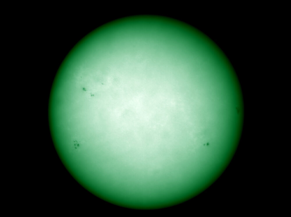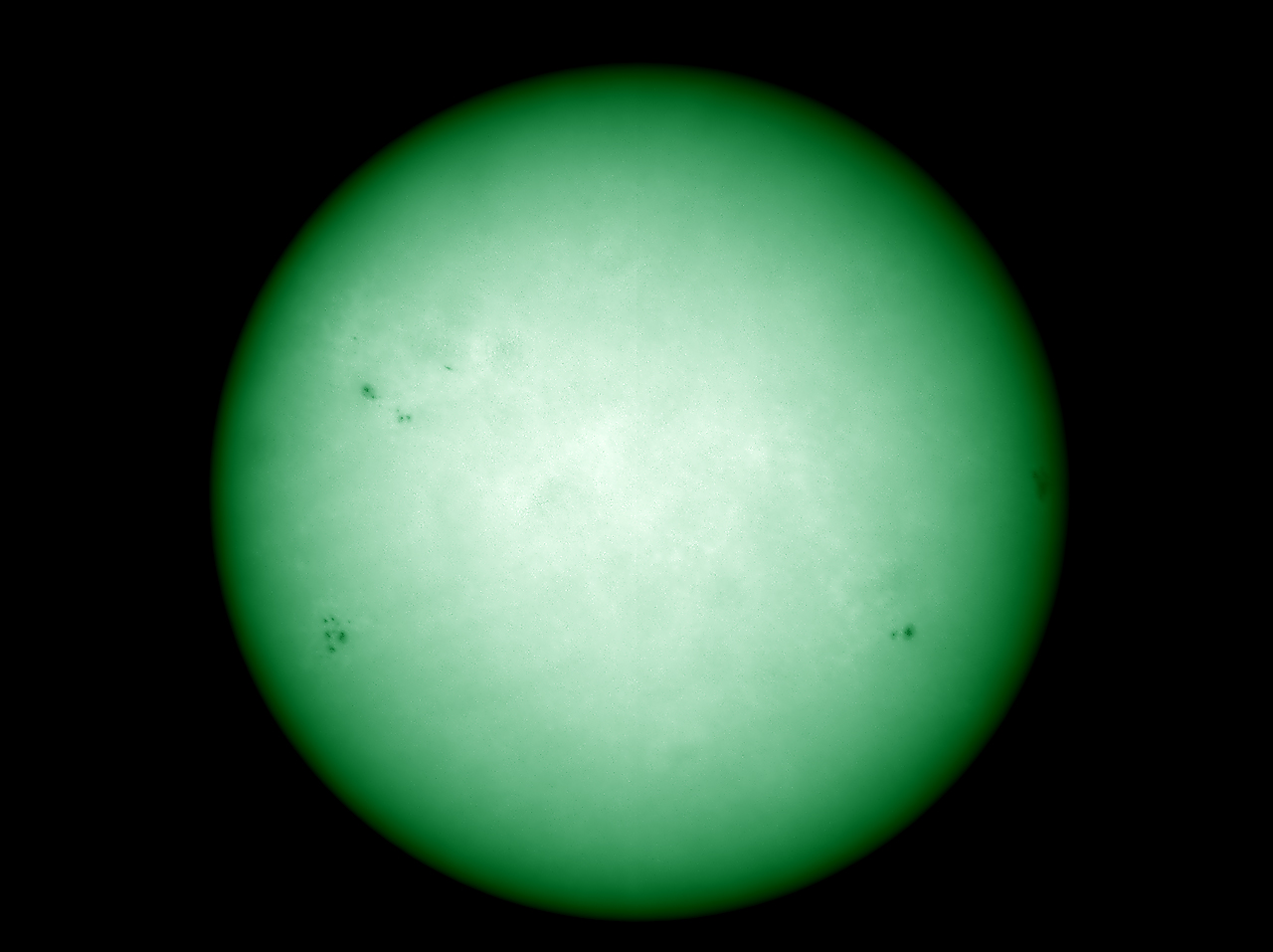 Sonnenscheibe im Magnesium-Licht (B2-Linie); Daystar Quark Magnesium-Filter (mit der Bandbreite von 10 Angström um 517nm) am Canon-Objektiv (Brennweite 135 mm, Öffnung: 67 mm); Kamera: PointGrey Grasshopper3-U3-28S5M; Bildverarbeitung: Einzelbild in Photoshop bearbeitet.