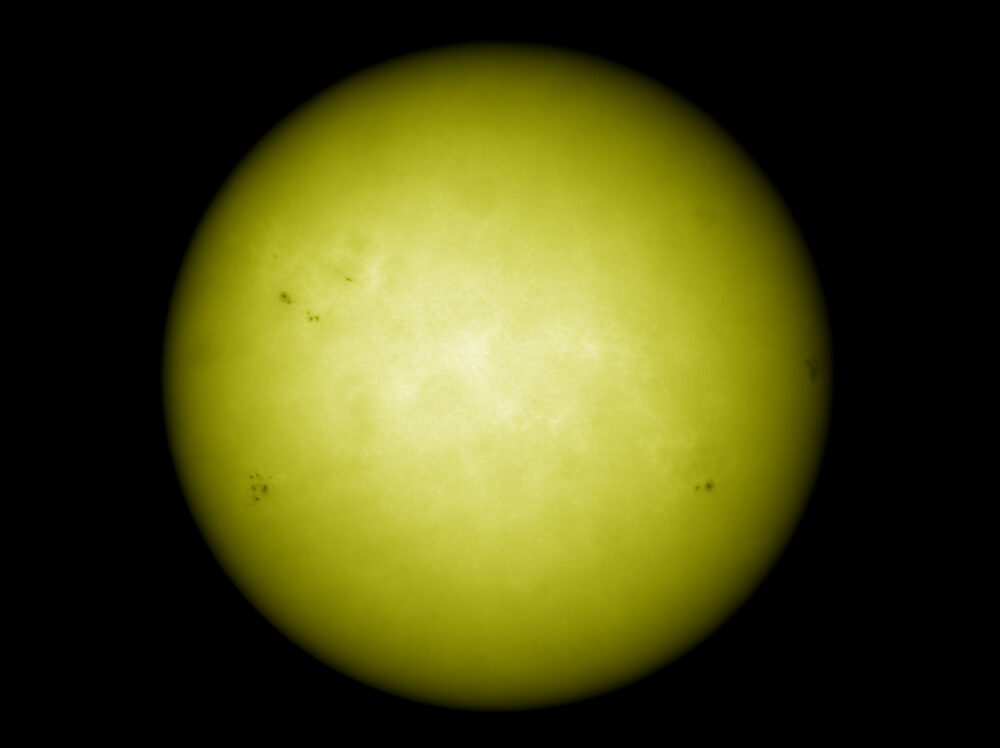 Sonnenflecken in Natrium-Licht (D-Linie); Daystar Quark Natrum-Filter (Bandbreite 0,5nm bei 589nm) an einem Canon-Objektiv (Brennweite 135 mm, Öffnung: 67 mm); Kamera: PointGrey Grasshopper3-U3-28S5M; Bildverarbeitung: 500 von 2500 Picts in Avistack und Photoshop bearbeitet.