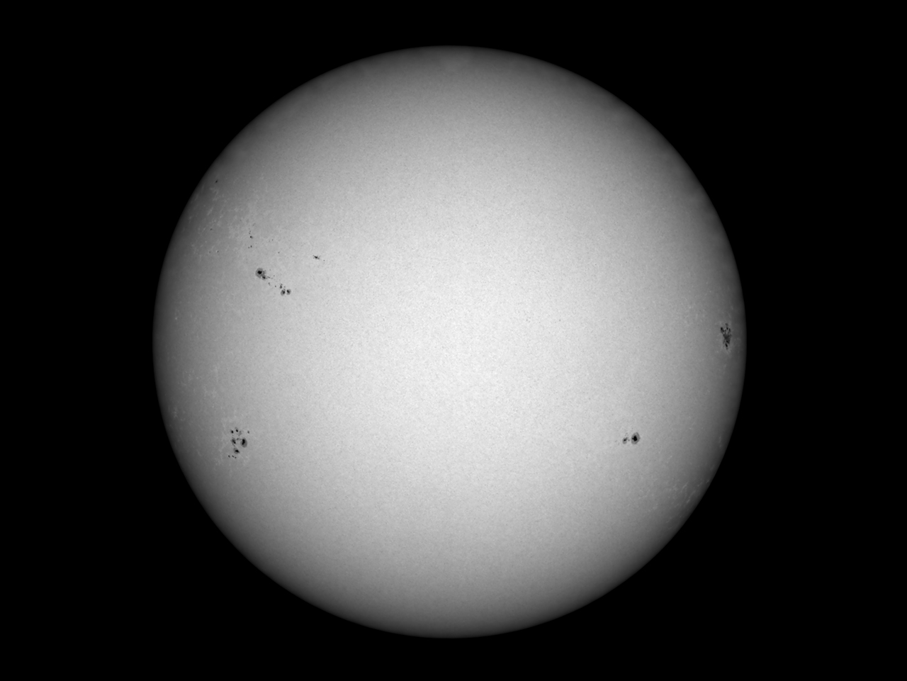 Sonnenscheibe im Weißlicht; Astro Solar Safety Film Photo (OD=3,8) mit Baader Solar Continuum Filter (mit der Bandbreite von 10 Angström um 540nm) am Takahashi FC-76DS (Brennweite 570 mm, Öffnung: 76 mm); Kamera: PointGrey Grasshopper3-U3-28S5M; Bildverarbeitung: 500 von 2500 Picts in Avistack und Photoshop bearbeitet.
