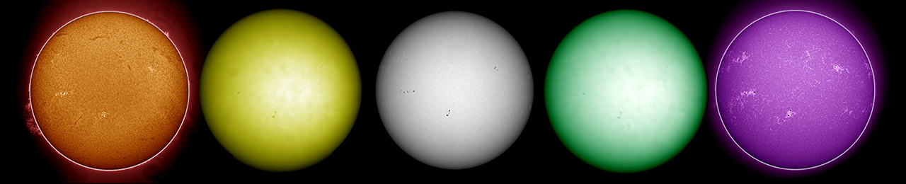 Neue Fleckenstrukturen zeigen sich auf den Übersichtsaufnahmen H-Alpha-Licht (656nm), im Natriumlicht (589nm), im Weißlicht (540nm), im Magnesium-Licht (517nm) und im Kalzium-Licht (393nm). Am Sonnenrand zeigen sich schöne Protuberanzen.